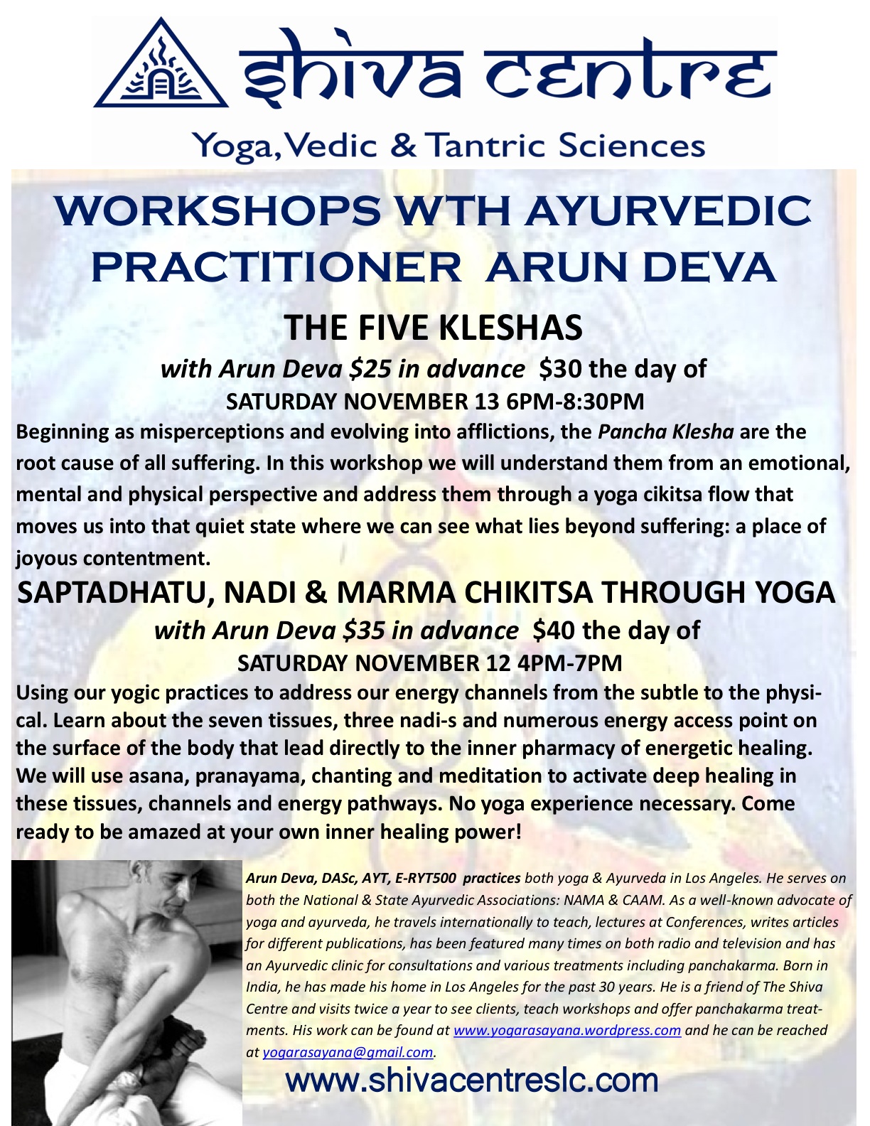 NOV 1-13: SALT LAKE CITY EVENTS AT SHIVA YOGA CENTRE: