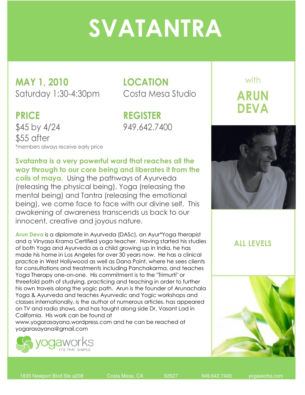 May 1: Svatantra: Alchemy Of Consciousness: Yoga Works, Costa Mesa