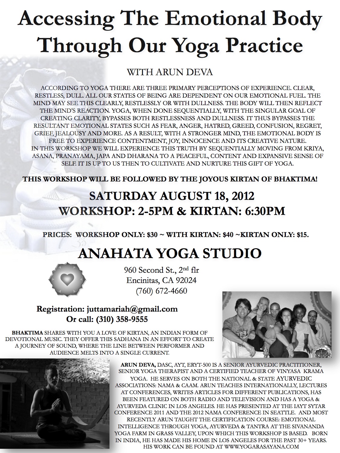 What I have discovered is that this Emotional Intelligence can be accessed even through just our yoga practice. I am putting this theory to the test coming up soon at the Sivananda Yoga Center, at Anahata Yoga Studio in Encinitas and at the Zen Den in San Clemente.