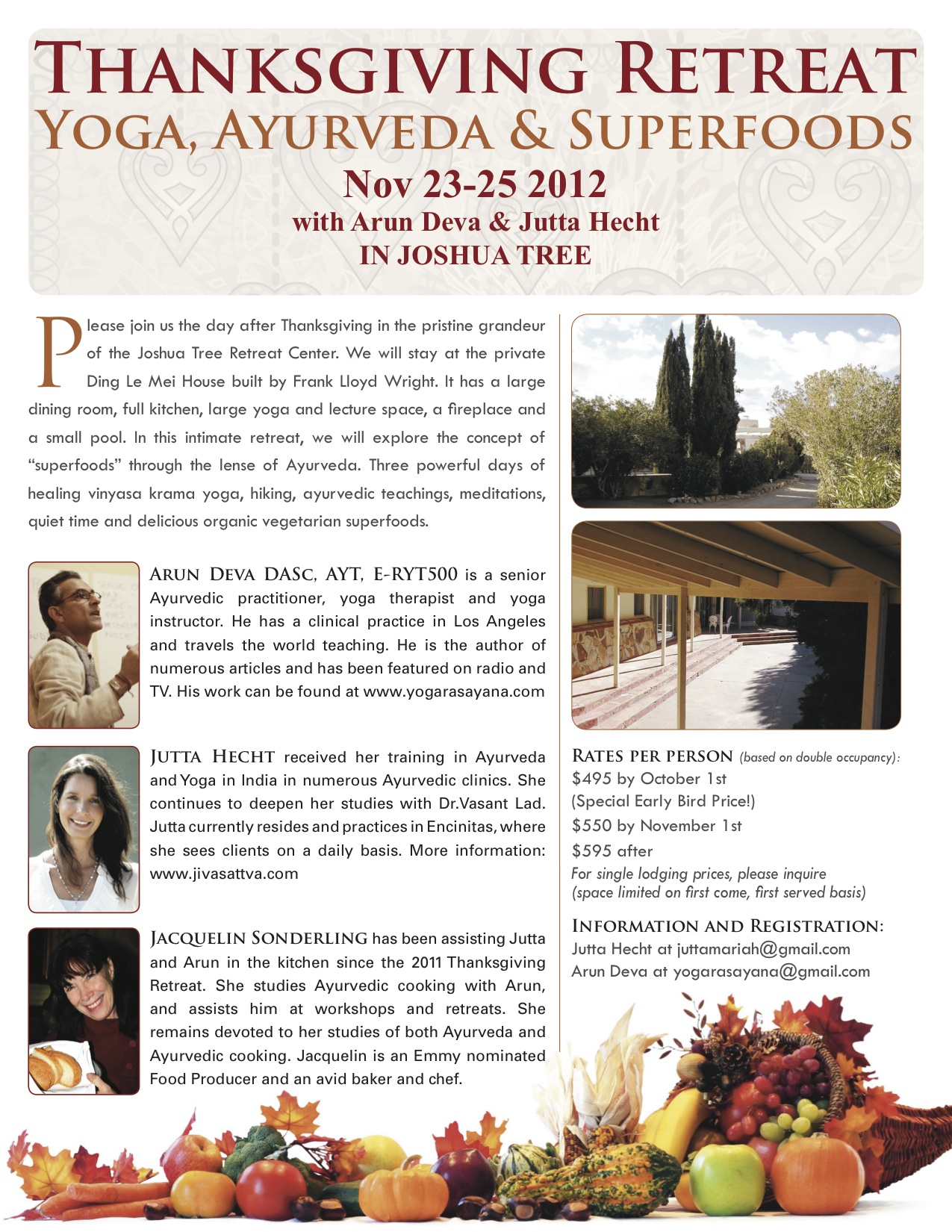 And then this November, for Thanksgiving, Jutta Hecht and I will host another Joshua Tree Retreat. The last one was a huge success. This time, once again starting the day after Thanksgiving, we will explore Ayurveda and Food: Raw, Cooked and Vegan! With yoga and a picnic hike. So, if you would like to share some of this year with me, I would love to share any and all of it with you!